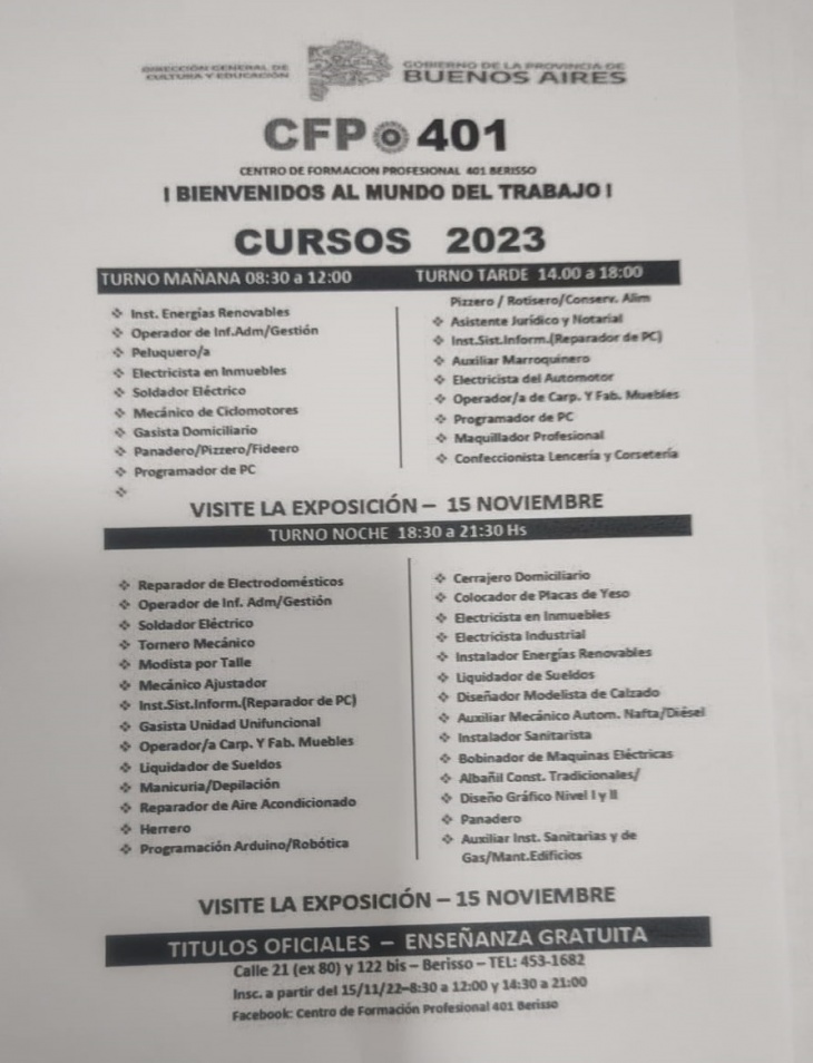 El Centro de Formación Profesional (CFP) N° 401 de Berisso, ubicado en la calle 80 entre 122 y 122 bis, lanzó una serie de cursos gratuitos con salida laboral.