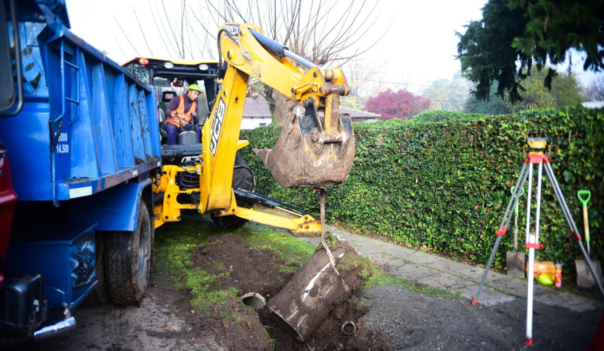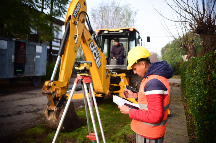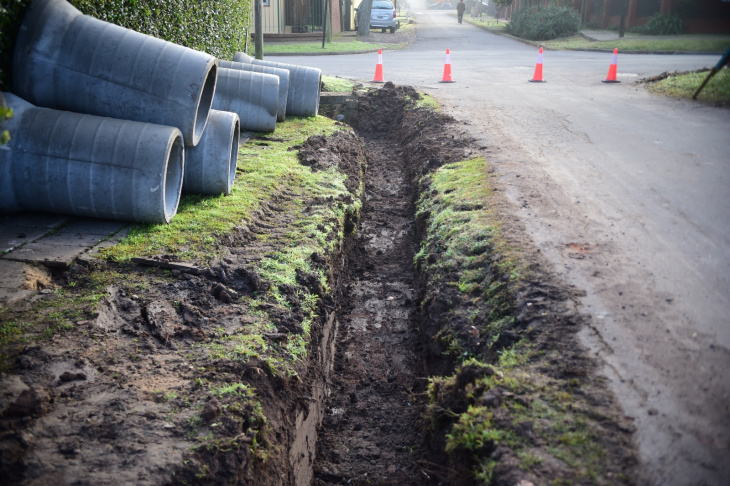 Actualmente, los trabajos incluyen la colocación de cañería de 600 milímetros desde calle 23 hacia calle 24 por la vereda impar, la readecuación de las líneas de cloacas existentes y el perfilado de la zanja para permitir la instalación del nuevo sistema de desagüe.