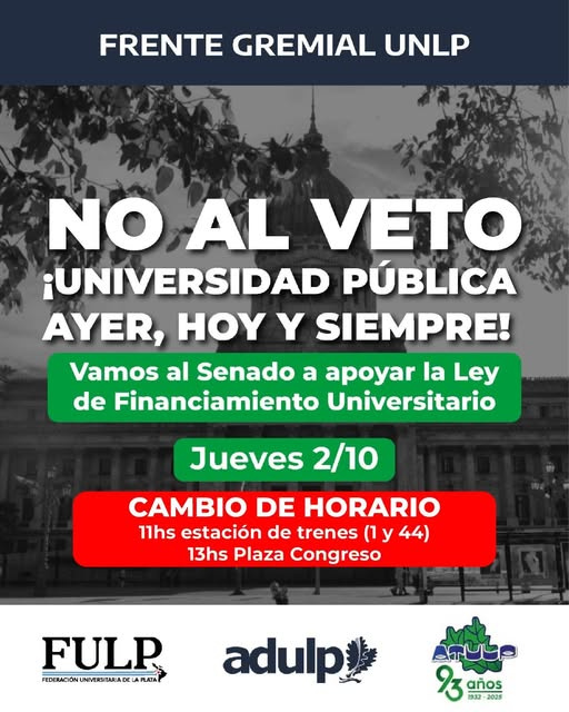 "Tras la histórica victoria en la Cámara de Diputados, volvemos al Congreso a exigirles a senadores y senadoras que rechacen a la Ley de Financiamiento Universitario", manifestó la Asociación de Docentes de la Universidad de La Plata (ADULP), junto a los trabajadores no docentes de ATULP y a la Federación Universitaria de La Plata (FULP).