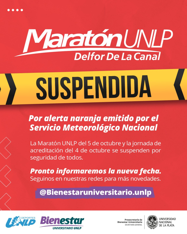 La Universidad Nacional de La Plata (UNLP) anunció la suspensión de la Maratón "Delfor De la Canal", que se iba a realizar este domingo 5 de octubre en la capital bonaerense.