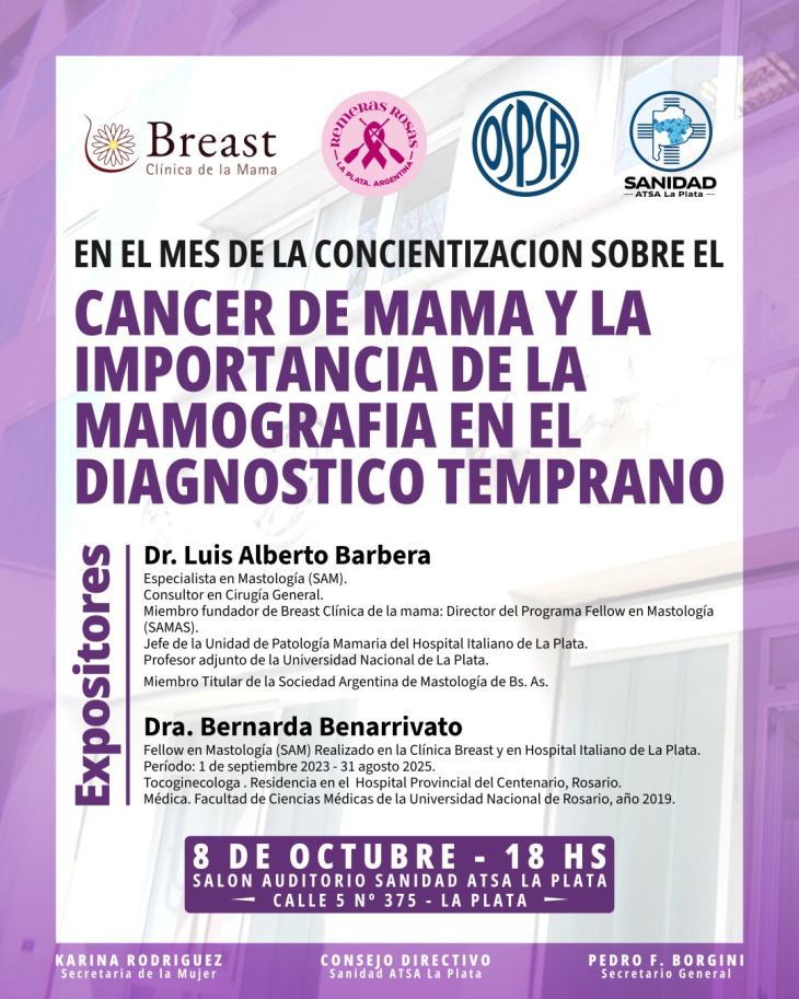 La Asociación de Trabajadores de la Sanidad Argentina (ATSA) Seccional La Plata organizará este miércoles 8 de octubre, a las 18 horas, una charla de concientización sobre el cáncer de mama en el Salón Auditorio del gremio, ubicado en 5 entre 39 y 40.