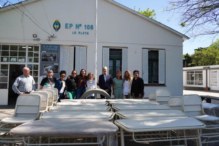 En la primaria ubicada en 30 y 697, fundada en 1950 y con una matrícula de 165 alumnos, el intendente participó de la entrega de pupitres y sillas que permitirán equipar un aula del establecimiento. El mobiliario fue producido en la fábrica que tiene la Provincia en Tolosa, la cual fue recuperada en 2020 y emplea a 150 trabajadores y trabajadoras.