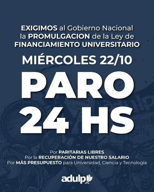 La Asociación de Docentes de la Universidad de La Plata (ADULP) realizará este miércoles 22 de octubre un paro de actividades por 24 horas "frente a la decisión del Poder Ejecutivo de demorar la promulgación y ejecución de la Ley de Financiamiento Universitario", según informó el gremio.