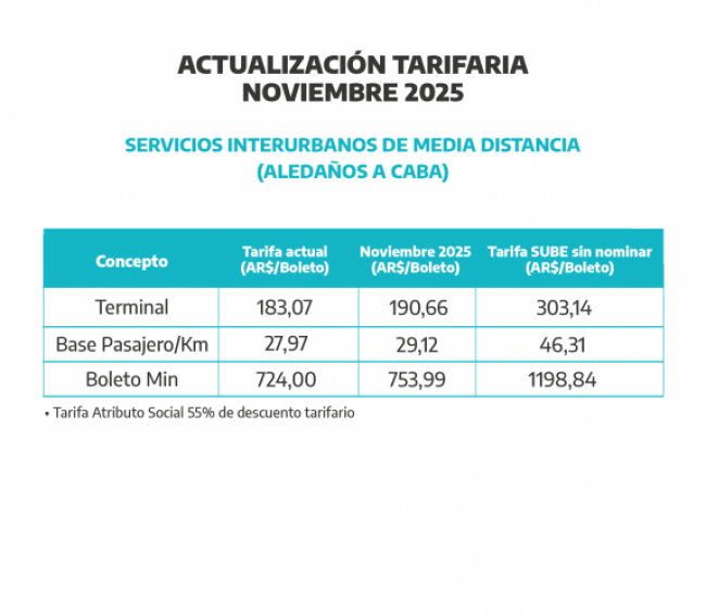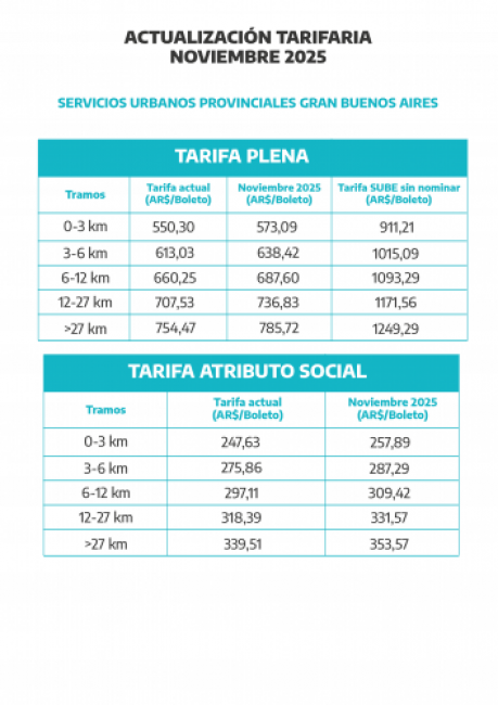 El cuadro tarifario fue actualizado de acuerdo al Índice de Precios al Consumidor (IPC) Nivel General de la Región Gran Buenos Aires, relevado por el Instituto Nacional de Estadísticas y Censo (INDEC), correspondiente al periodo mensual de septiembre del 2025. La suba entrará en vigencia a partir de las 00 horas del este sábado 1 de noviembre.