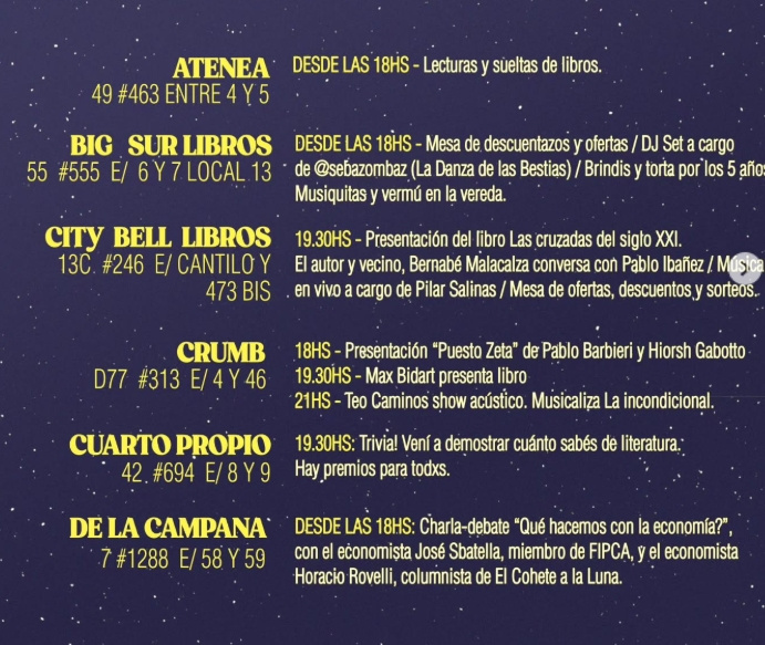 Durante la jornada, los asistentes podrán disfrutar de todo tipo de actividades, tales como charlas, lecturas, música, ofertas y sorteos, entre otras. Las librerías participantes son las siguientes: