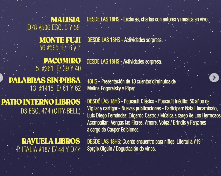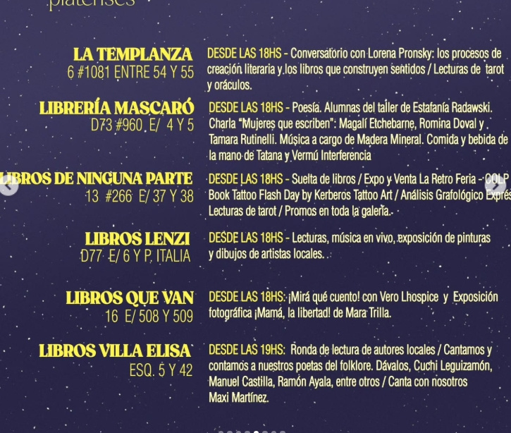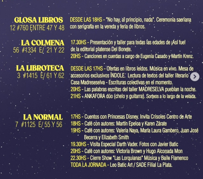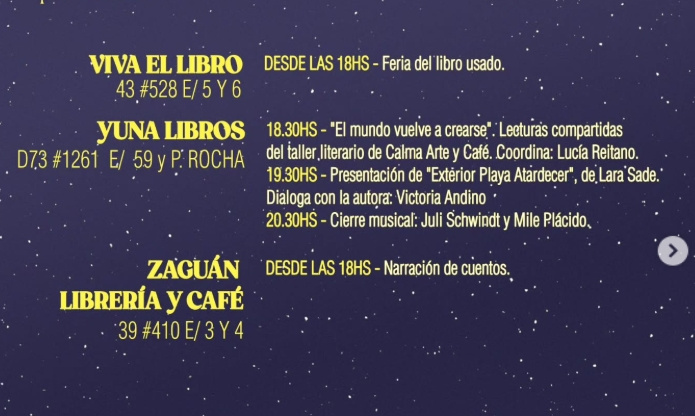 Como parte del evento, @yunalibros y @calma.arteycafe organizarán desde las 18:30 horas en diagonal 73 N° 1261 entre 59 y Plaza Rocha "El mundo vuelve a crearse", lecturas compartidas del taller literario de Calma Arte y Café.