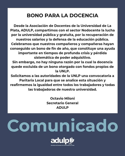 Conocida la noticia, la Asociación de Docentes de la Universidad de La Plata (ADULP), que está realizando un paro de 72 horas en reclamo de aumento salarial al gobierno nacional y el cumplimiento de la ley de financiamiento universitario, destacó el anuncio para los no docentes, "que constituye una ayuda importante en tiempos de profunda crisis y pérdida sistemática de poder adquisitivo", pero aseguró que "no hay ninguna razón por la cual la docencia quede excluida de un bono otorgado con fondos propios de la UNLP".