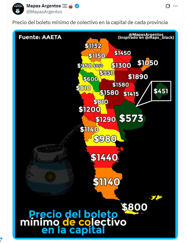 Una infografía publicada este viernes desde la cuenta de "X" @MapasArgentos, muestra el precio de los boletos de colectivos mínimos en cada capital provincial de la Argentina. Fue elaborada con datos que informó la Asociación Argentina de Empresarios del Transporte Automotor (AAETA) en octubre, y pone en blanco sobre negro la gran disparidad que existe en el territorio nacional en el costo para viajar en el transporte público de pasajeros.