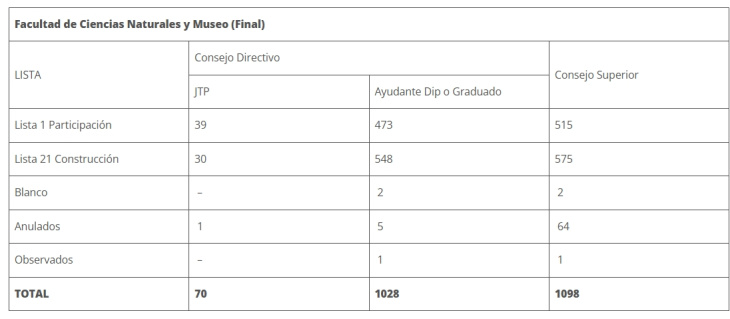 Este sábado por la tarde se conocieron los resultados de las elecciones de los representantes de graduados/auxiliares diplomados y jefes de trabajos prácticos (JTP) en la Facultad de Ciencias Naturales y Museo de la Universidad Nacional de La Plata (UNLP), que se realizaron entre el miércoles y hoy.