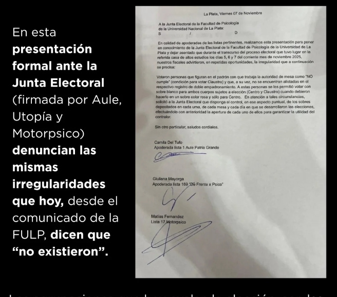 A través de un posteo en su cuenta de Instagram, FR aseguró que las mismas organizaciones (Aule, Utopía y Motorpsico) que firmaron una nota a la Junta Electoral denunciando irregularidades en el proceso eleccionario "pocos días después firman junto con la FULP un comunicado diciendo que 'la elección fue normal y transparente'".