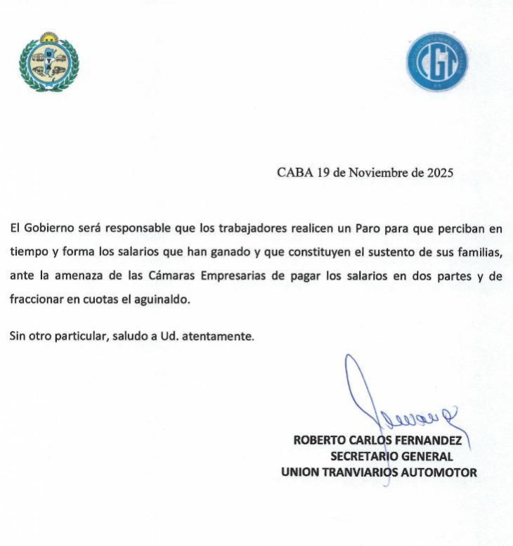 La Unión Tranviarios Automotor (UTA) adelantó que llevará adelante un paro en todo el país si persiste la "amenaza" de las cámaras empresarias de pagar los sueldos en dos veces y fraccionar el aguinaldo.