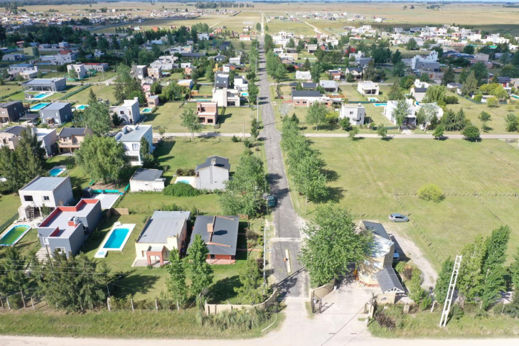 Vista aérea de Domselaar Chico, el primer barrio cerrado de la localidad, que impulsó el crecimiento residencial desde 2006 y dio origen a nuevos proyectos como Estancias de Domselaar Chico, Los Tilos y Las Margaritas.