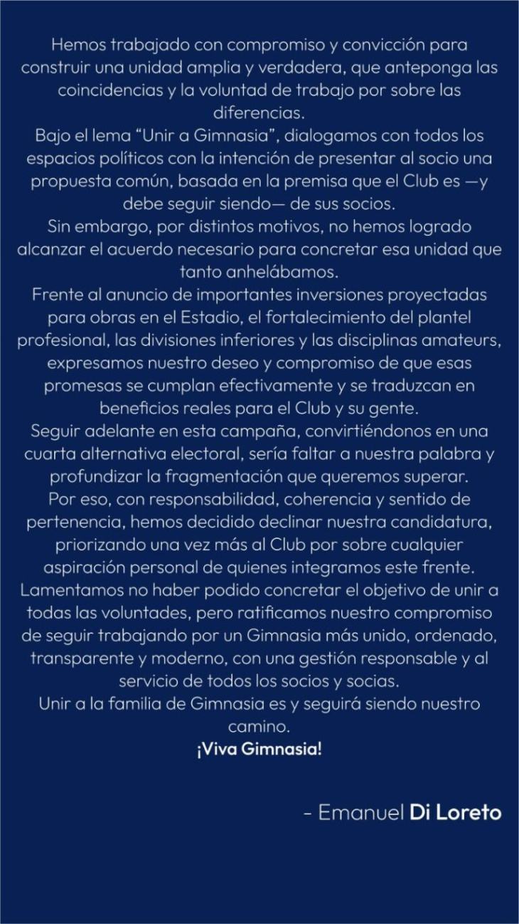 "Por eso, con responsabilidad, coherencia y sentido de pertenencia, hemos decidido declinar nuestra candidatura, priorizando una vez más al Club por sobre cualquier aspiración personal de quienes integramos este frente”, concluyó.