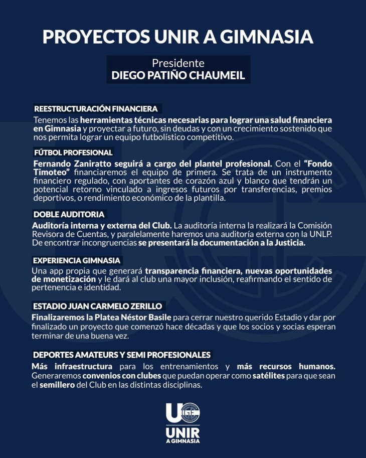 "Tenemos las herramientas técnicas necesarias para lograr una salud financiera en Gimnasia y proyectar a futuro, sin deudas y con un crecimiento sostenido que nos permita lograr un equipo futbolístico competitivo", aseguró la lista.