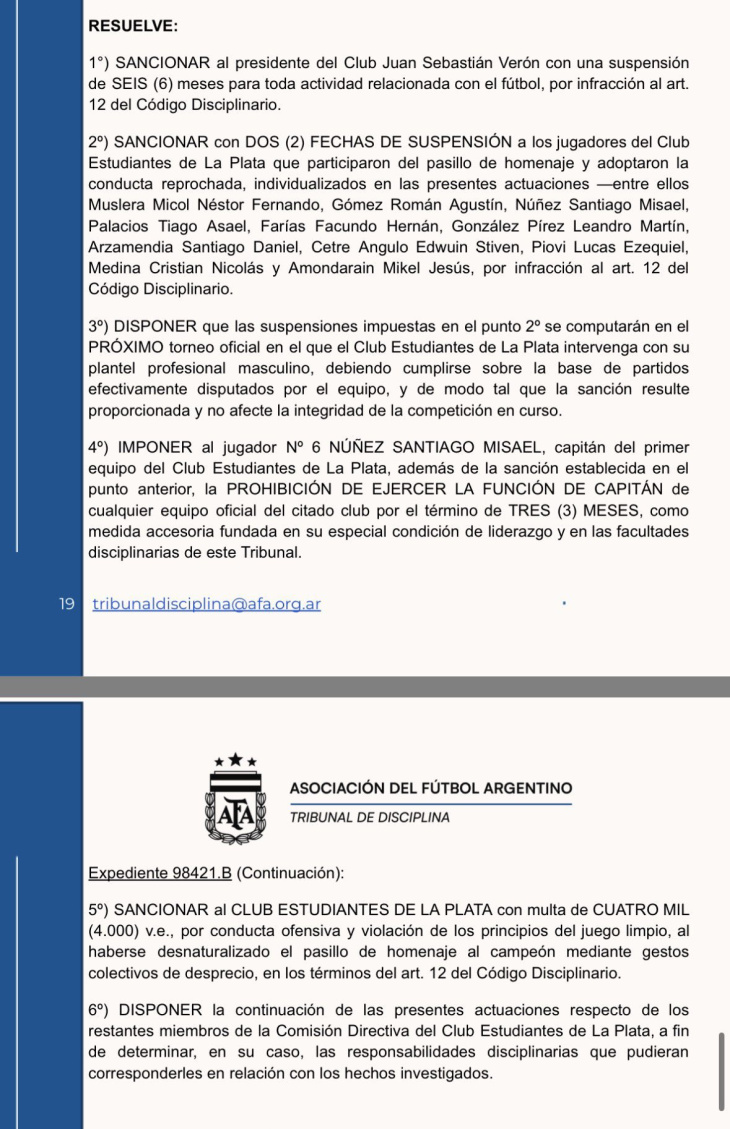 La dictadura de Chiqui Tapia-Toviggino suspendió por dos fechas en el próximo torneo a todos los jugadores de Estudiantes de La Plata que participaron del "pasillo" que la misma AFA los obligó a hacer. Y por 6 meses a su presidente, Juan Sebastián Verón. Alguien debe frenar este… pic.twitter.com/V4JHLobH4R
