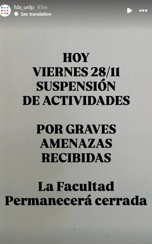 La Facultad de Artes de la Universidad Nacional de La Plata (UNLP) suspendió este viernes sus actividades luego de que se recibieran "graves amenazas".