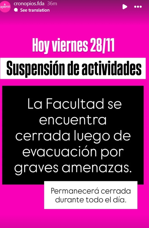 Por su parte, la cuenta oficial de la casa de altas estudios confirmó más tarde que la medida se prolongaría durante todo el día de hoy 28 de noviembre.