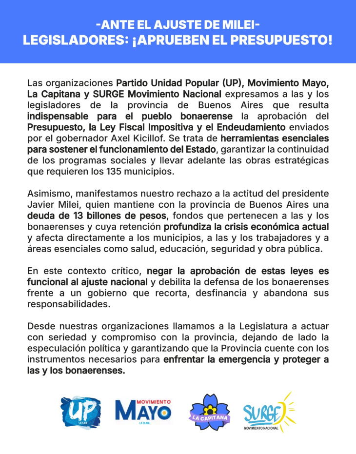 El partido Unidad Popular (UP), Movimiento Mayo, La Capitana y SURGE Movimiento Nacional se sumaron al pedido de gremios y otras organizaciones sociales para que la Legislatura de la Provincia de Buenos Aires apruebe el endeudamiento pedido por el gobernador Axel Kicillof.