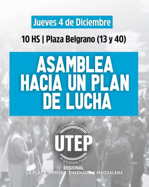 Organizaciones sociales agrupadas en la Unión de Trabajadores de la Economía Popular (UTEP) harán este jueves 4 de diciembre una asamblea en Plaza Belgrano de La Plata, ubicada en 13 y 40, para definir el plan de lucha a seguir.