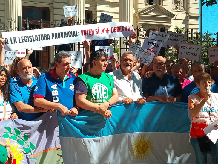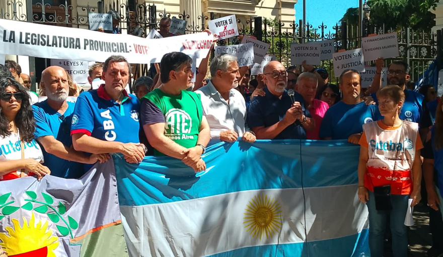 Dirigentes y militantes bonaerenses de la CTA Autónoma, la CTA de los Trabajadores y la CGT Regional La Plata, Berisso y Ensenada se manifestaron este miércoles frente a la Legislatura de la Provincia de Buenos Aires para pedir la sanción de la ley de financiamiento pedida por el gobernador Axel Kicillof.