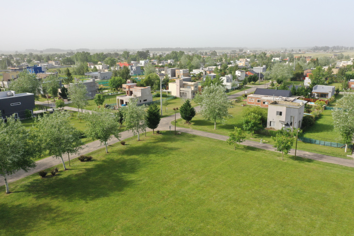 Vista aérea del Barrio cerrado Estancias de Domselaar Chico, con sus corredores verdes y áreas parquizadas que estructuran el arbolado público del sector. En primer plano se observa el barrio cerrado Domselaar Chico, donde las forestaciones urbanas recientes acompañan el crecimiento residencial.