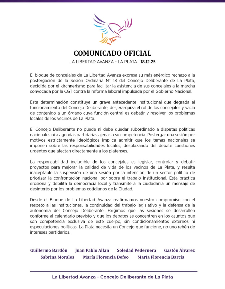 "Postergar una sesión por motivos estrictamente ideológicos implica admitir que los temas nacionales se imponen sobre las responsabilidades locales, desplazando del debate cuestiones urgentes que afectan directamente a los platenses", agregó el espacio libertario.