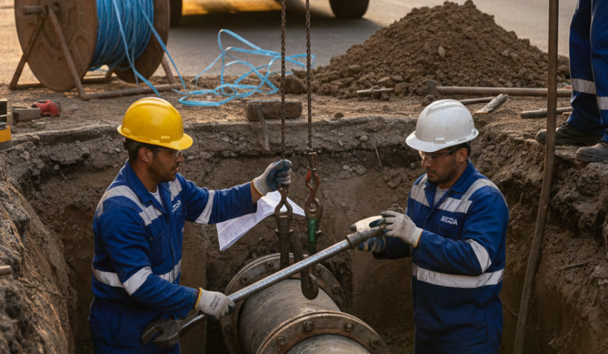 Operarios de la empresa Aguas Bonaerenses SA (ABSA) reparan este viernes una cañería en la intersección de las calles 1 y 89 bis de la localidad de Villa Elvira.