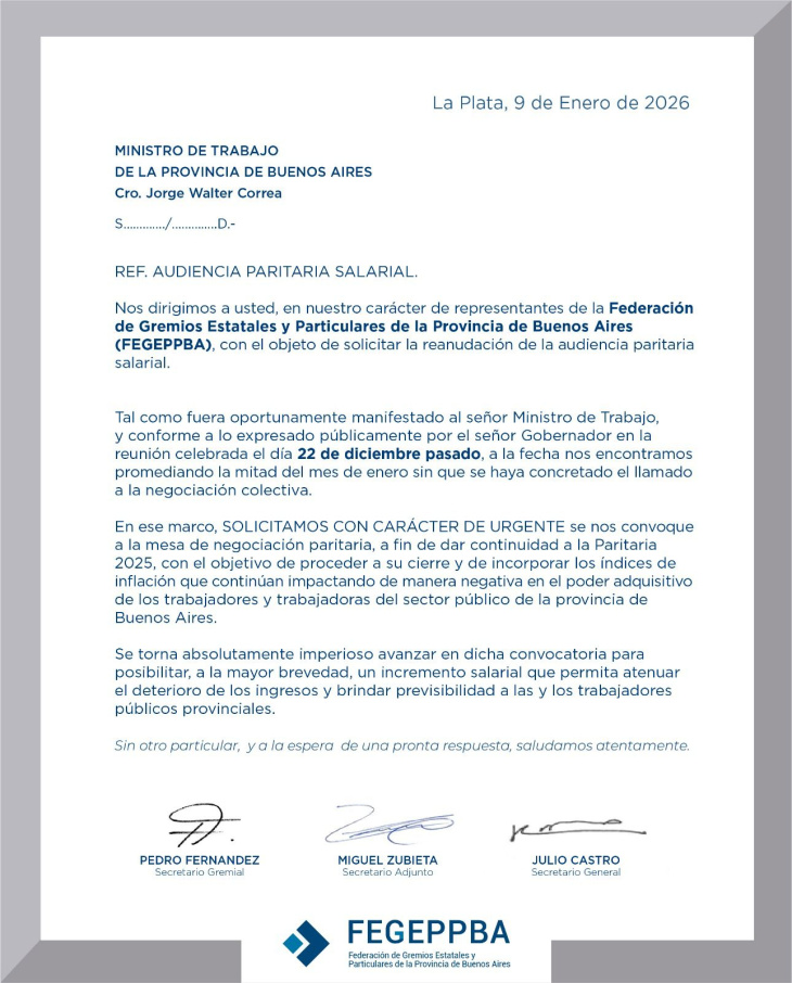El Frente de Unidad Docente Bonaerense (FUDB) presentó una nota formal ante el Ministerio de Trabajo de la Provincia de Buenos Aires, donde dejó constancia de que no considera cerrada la discusión salarial 2025 y reafirmó su compromiso "con la defensa de los derechos de las y los docentes".