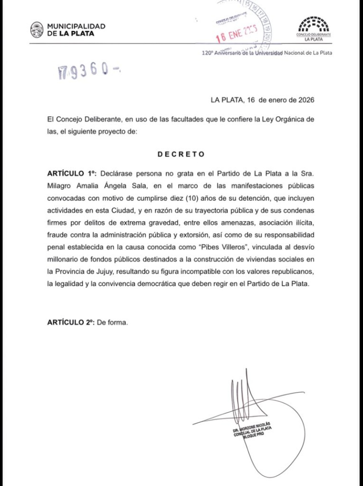 "Presenté un Decreto en el Concejo Deliberante para declararla personalidad no grata en nuestro Municipio. Los sentenciados por corrupción no son bienvenidos en La Plata", informó el edil en un posteo realizado en la red X.