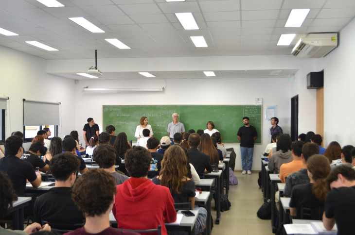 El decano de la Facultad, Marcos Actis, la vicedecana Patricia Arnera, el secretario académico Andrés Martínez del Pezzo y la profesora titular de Mate Pi, Rossana Di Domenicantonio, recorrieron las aulas para dar la bienvenida a los ingresantes. Vale aclarar que esa unidad académica cuenta con trece carreras.
