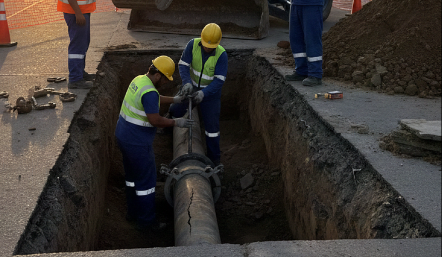 Operarios de la empresa Aguas Bonaerenses SA (ABSA) realizan este miércoles trabajos sobre una cañería de la red de agua en la intersección de las calles 471 y 133 de City Bell.