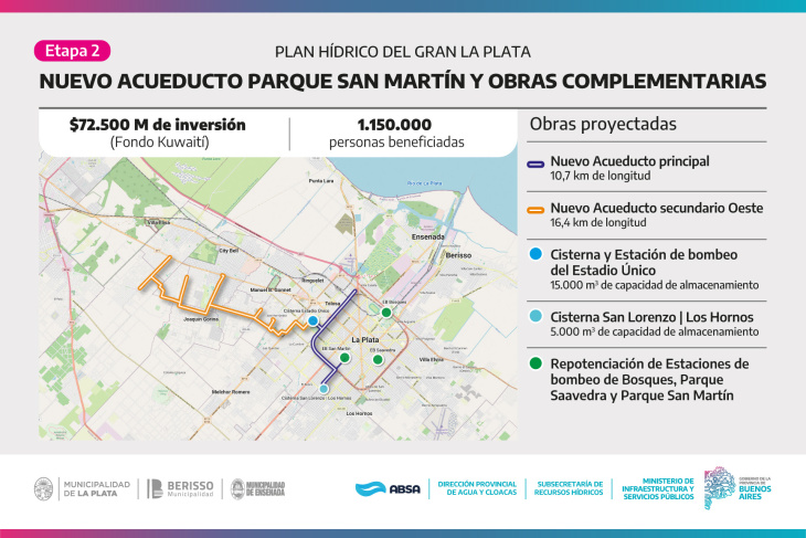 Esta segunda etapa incluye la ejecución del Acueducto Parque San Martín, la construcción de una Cisterna y Estación de bombeo del Estadio Único, una nueva Cisterna de hormigón en San Lorenzo y Los Hornos, el Acueducto secundario oeste y la repotenciación de Estaciones de bombeo de agua de La Plata.
