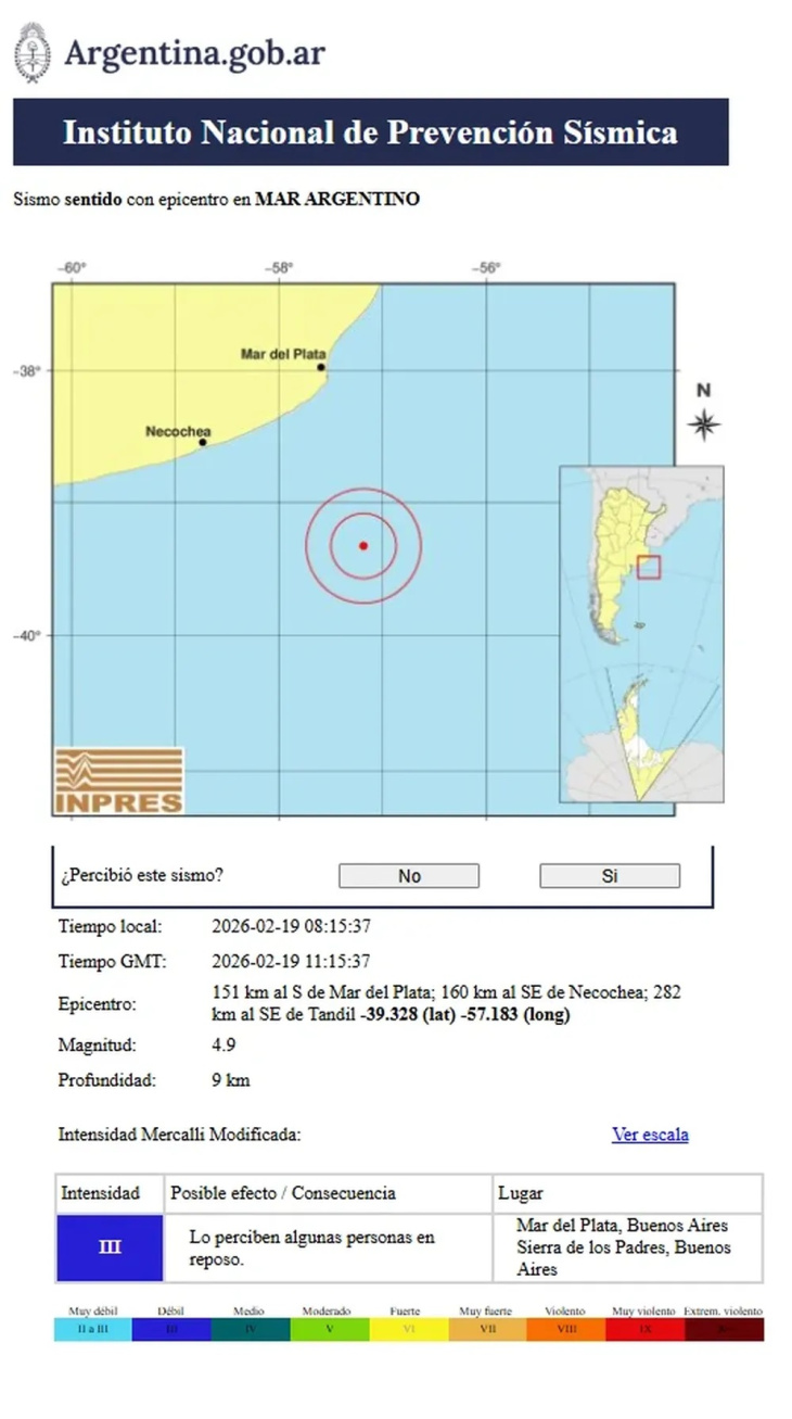 El Instituto Nacional de Prevención Sísmica (INPRES) registró un sismo con una magnitud de 4,9 y lo calificó como de intensidad “débil”. Según el informe, el fenómeno tuvo epicentro a unos 151 kilómetros al sur de Mar del Plata y 160 kilómetros al sudeste de Necochea, en el Atlántico Sur.