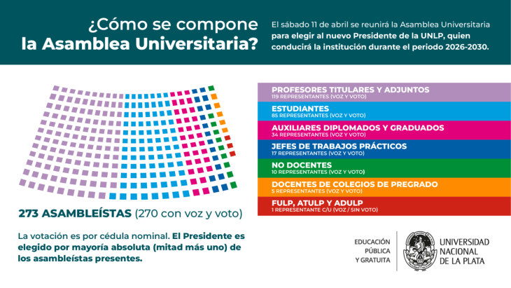 La Asamblea es el máximo órgano de cogobierno de la Universidad y está constituida por 270 asambleístas con voz y voto, que representan a todos los claustros de las facultades (docentes, estudiantes, jefes de trabajos prácticos, auxiliares diplomados, graduados, y no docentes) y a los docentes de los Colegios del sistema de pregrado. También incluye la participación de un representante por cada gremio (ATULP, ADULP, y FULP), con voz y sin voto.