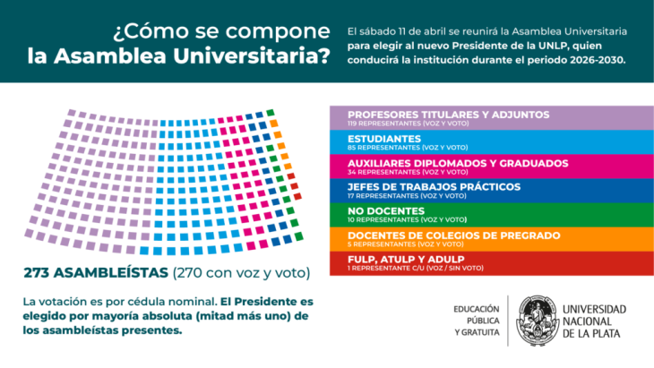 "La Asamblea Universitaria es el máximo órgano de cogobierno de la Universidad y está constituida por 270 asambleístas con voz y voto, que representan a todos los claustros de las facultades (docentes, estudiantes, jefes de trabajos prácticos, auxiliares diplomados, graduados, y Nodocentes) y a los docentes de los Colegios del sistema de pregrado. Además, incluye la participación de un representante por cada gremio (ATULP, ADULP, y FULP), con voz y sin voto", aclaró la UNLP en su sitio web.