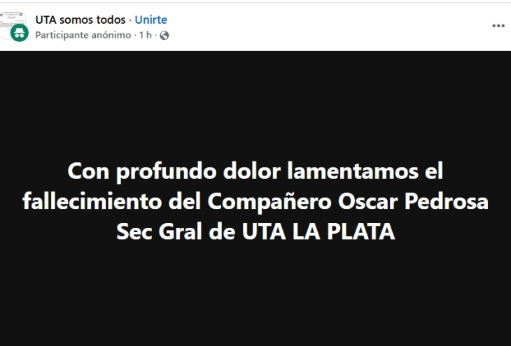 Este lunes falleció el secretario general de la Unión Tranviarios Automotor (UTA) La Plata Oscar Pedrosa, quien en diciembre de 2022 había logrado la reelección al frente del gremio.