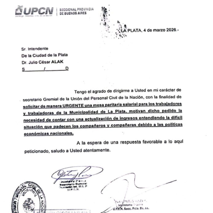 La Unión del Personal Civil de la Nación (UPCN) de la Provincia de Buenos Aires solicitó la "urgente" convocatoria a paritaria salarial al intendente de La Plata, Julio Alak.