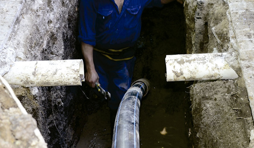 Operarios de la empresa Aguas Bonaerenses SA (ABSA) trabajan este sábado en la reparación de una cañería de agua en calle 164 entre 13 y 14 de Berisso.