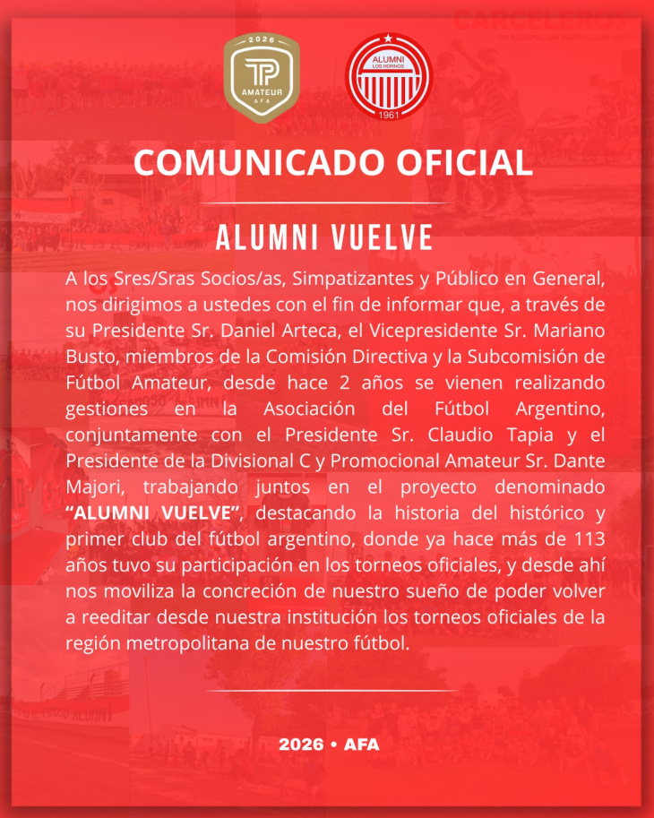 En este último, se destaca que el club viene trabajando en el proyecto "ALUMNI VUELVE" desde hace dos años, resaltando "la historia del primer club del fútbol argentino, que hace más de 113 años tuvo su participación en los torneos oficiales".