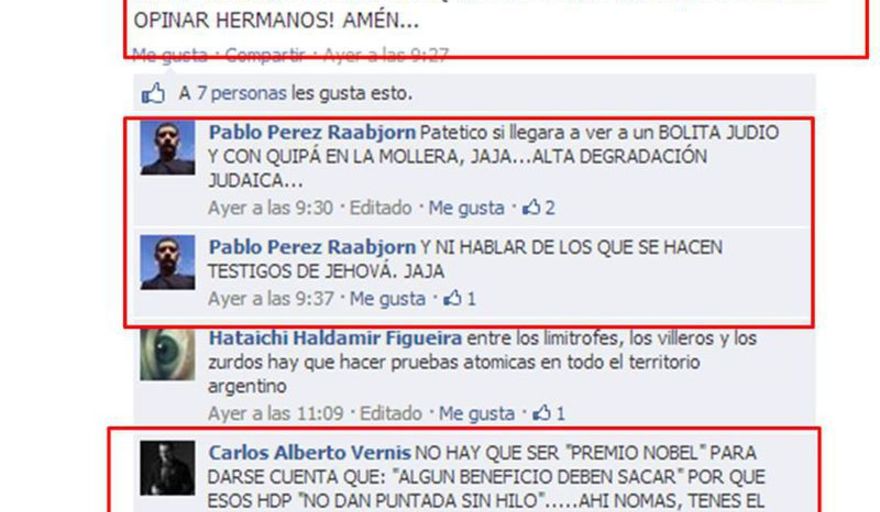 Cuando los lectores ya superan el límite de su propia incredulidad, se topan con frases como ésta: (Los inmigrantes) No deben tener prioridad en la educación, salud, vivienda, o planes sociales, como sucede desde hace mucho tiempo. O para peor, imágenes del estilo “STOP INMIGRACIÓN: Porque disfrutan de nuestras tierras y traen más gente a infectar nuestro suelo, ¿hasta cuándo hemos de aguantar a esta clase de personas robando nuestros beneficios?”. Más debajo de la página, vemos cómo tratan de “judía, camporita e infiltrada” a una militante del Fpv a la que luego echaron del grupo.