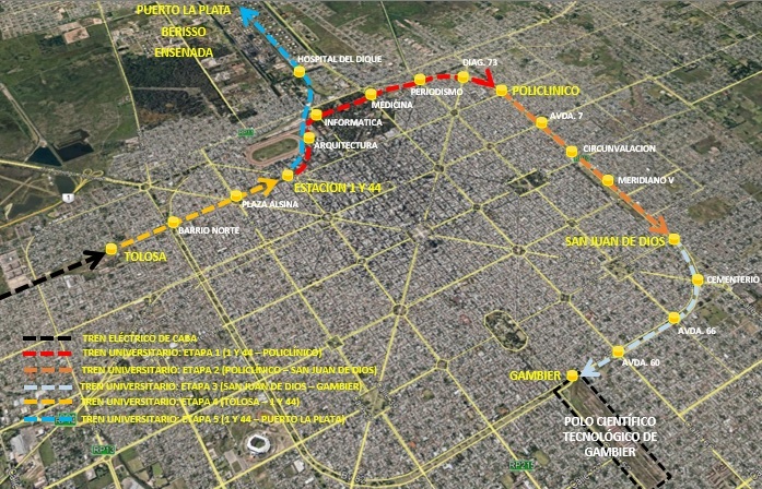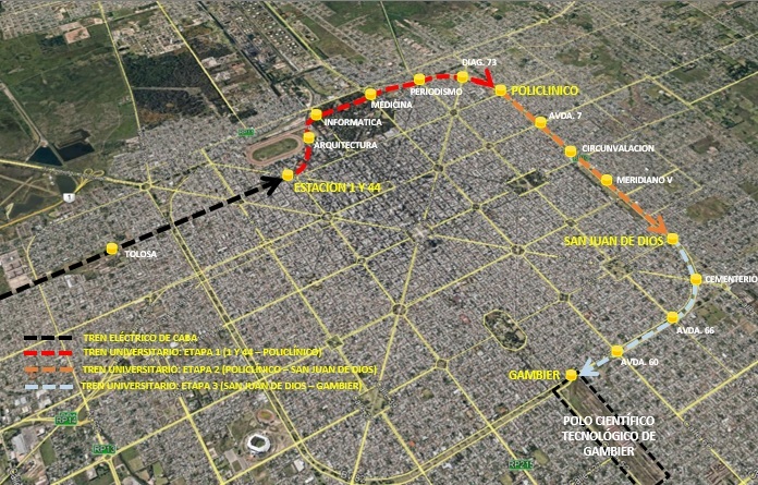 Precisamente hasta el predio de Gambier llegará el Tren Universitario. Cabe recordar que la UNLP también extenderá el recorrido de la formación ferroviaria; el servicio que desde la Estación de 1 y 44 llegaba hasta el Policlínico San Martín ubicado en 1 y 72, sumará casi 7 kilómetros en una primera etapa para llegar hasta 131 y 55, destino de los denominados Talleres Ferroviarios.