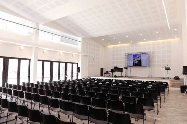 El auditorio es una construcción de 230 m2 de superficie, que se vincula con el patio del colegio a través de una galería semi cubierta que permite establecer relaciones entre ambos espacios para que las actividades puedan extenderse y multiplicarse hacia el exterior cuando el clima o el espectáculo lo demanda. La construcción también incluyó un buffet lindero y una amplia terraza, ambos con vista hacia el jardín del colegio.