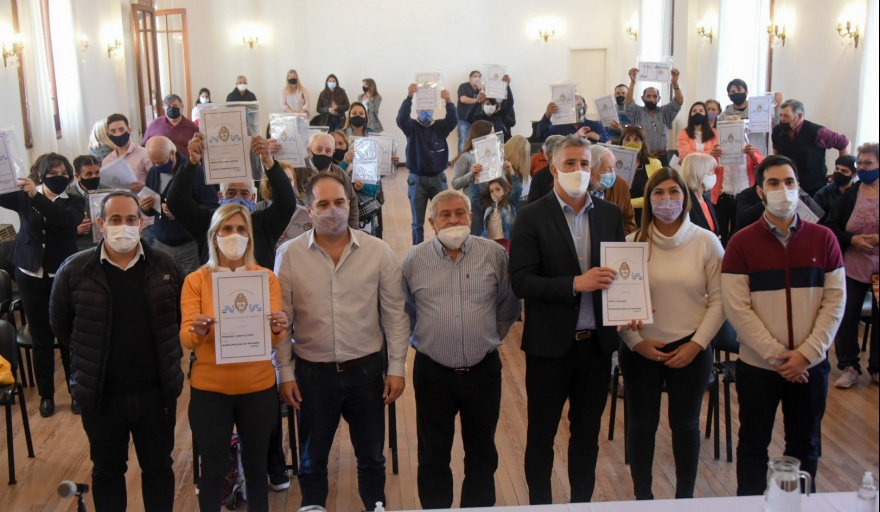 El ministro de Producción, Ciencia e Innovación Tecnológica, Augusto Costa, encabezó el acto en San Fernando con el intendente Juan Andreotti, en tanto que el jefe de Gabinete del Ministerio de Desarrollo Agrario, Jonatan Sánchez, entregó las escrituras en Navarro junto al intendente Facundo Diz.