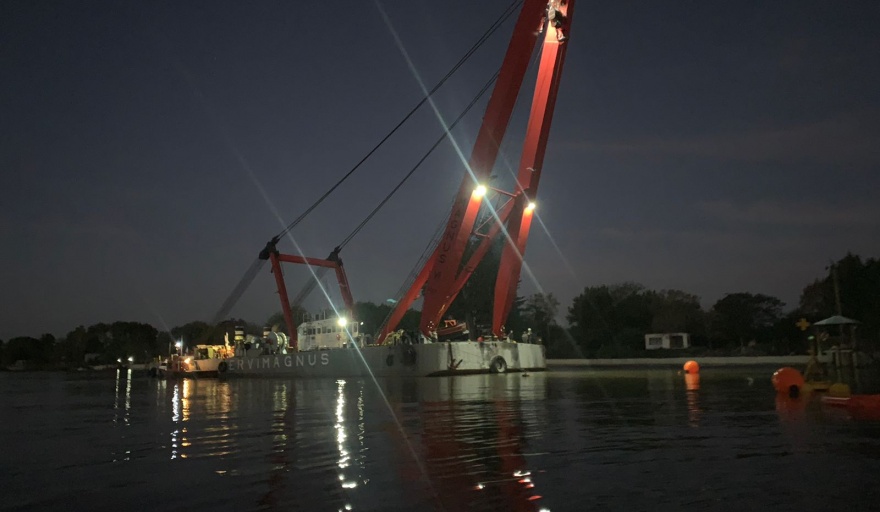 Esta mañana con la asistencia de una grúa y personal especializado comenzaron las tareas para reflotar un remolcador hundido el 16 de octubre último en cercanías del puerto de La Plata tras chocar con un buque petrolero.
