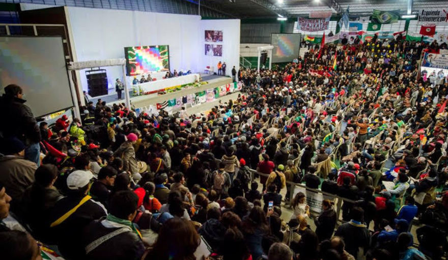El clima del encuentro estuvo signado por el colorido de las banderas de organizaciones políticas venidas de países tan distantes como Kurdistan y Canadá, representaciones sindicales como la COB – Central Obrera Boliviana -, la Unión de Agricultura de Palestina, Federación de Cooperativas de Vivienda de Uruguay y Venezuela y organizaciones campesinas de Latinoamérica.