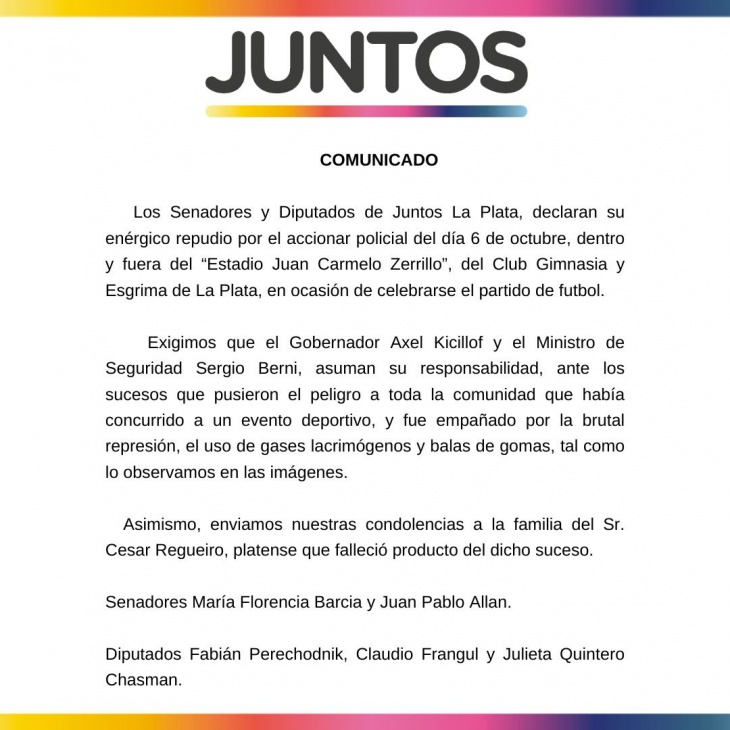 Los Senadores y Diputados de Juntos La Plata también declararon su "enérgico repudio por el accionar policial del día 6 de octubre, dentro y fuera del “Estadio Juan Carmelo Zerrillo”, del Club Gimnasia y Esgrima de La Plata, en ocasión de celebrarse el partido de fútbol".