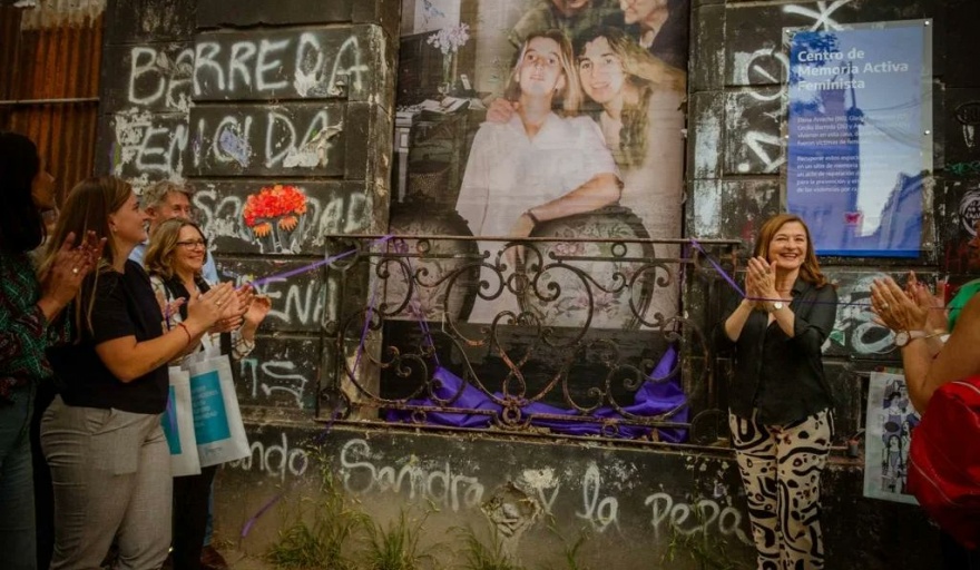 “Centro de Memoria activa feminista. Elena Arreche (86), Gladys McDonald (57); Cecilia Barreda (26) y Adriana Barreda (24) vivieron en esta casa donde luego fueron víctimas de femicidio. Recuperar este espacio y transformarlo en sitio de memoria constituye un acto de reparación desde el Estado para la prevención y erradicación de las violencias por razones de género”, se lee en la placa transparente colocada esta tarde junto al portón negro del frente de la vivienda.