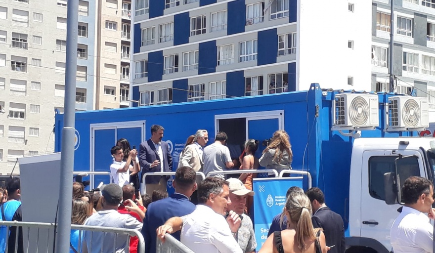 El Presidente, Alberto Fernández, visitó este lunes la localidad de Miramar para anunciar la construcción de una cancha de hockey en el distrito y recorrer un móvil oftalmológico, que recorre distintas ciudades del país y realiza anteojos en el instante, y una playa deportiva.