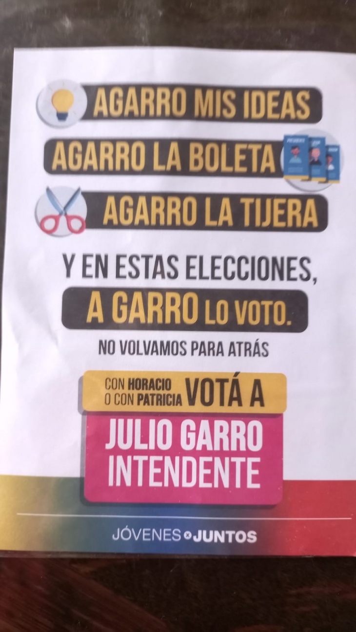 No obstante, en las ´últimas semanas, el funcionario comunal y bulrrichista Mauro Palummo comenzó a militar con mucha fuerza el corte de boleta Bullrich - Garro, algo que imitó una supuesta agrupación denominada "Jovenes x Juntos". que este viernes realizó un masivo bajo puerta por toda la ciudad llamando a cortar a favor del intendente en lo local.