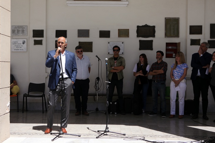 El presidente de la Universidad Nacional de La Plata, Martín López Armengol, participó este mediodía en el Colegio Nacional “Rafael Hernández” de una serie de actividades programadas en marco del 40° aniversario del regreso de la democracia que incluyó la denominación de “Patio de la Democracia” a uno de los espacios abiertos del establecimiento que da hacia la calle 50.